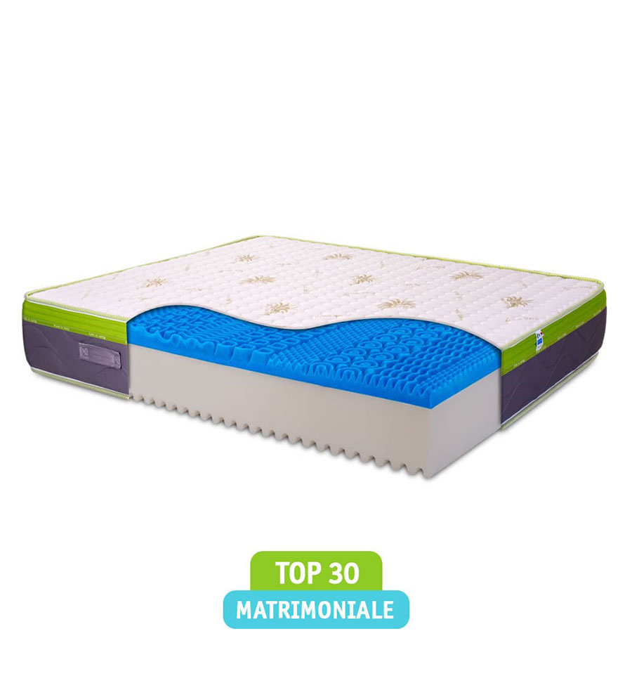 E' alto 30 cm e si compone di una lastra formata semplicemente da due strati, all’interno ha una struttura altamente traspirante composta da una lastra in memory gel breeze da 5 cm e una in poliuretano espanso alta portanza da 24 cm.