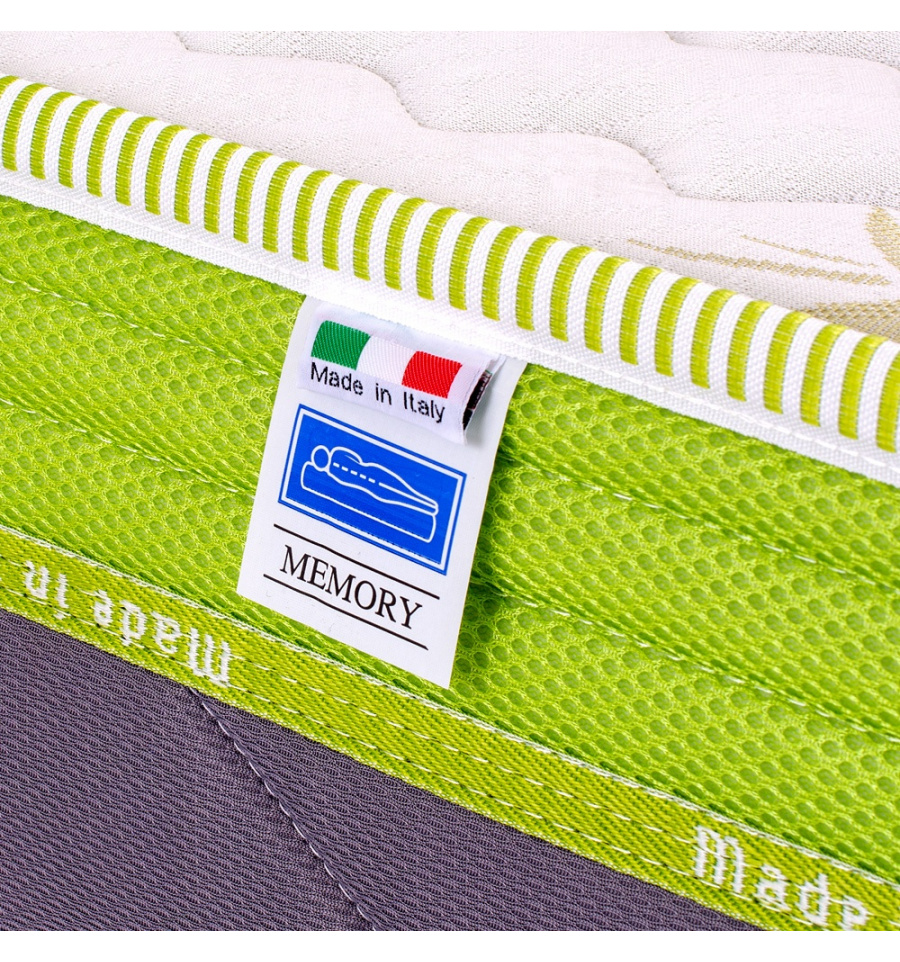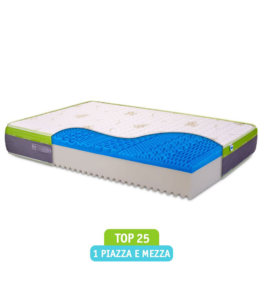 Materasso economico da una piazza e mezza, disponibile in due diverse misure. Alto 25 cm, con memory gel breeze bugnato ergonomico da 5cm, ha una superficie ad alta portanza. Rivestimento sfoderabile con Aloe Vera, fascia perimetrale traspirante. E’ antibatterico e antiacaro, con garanzia 10 anni INfamily.
