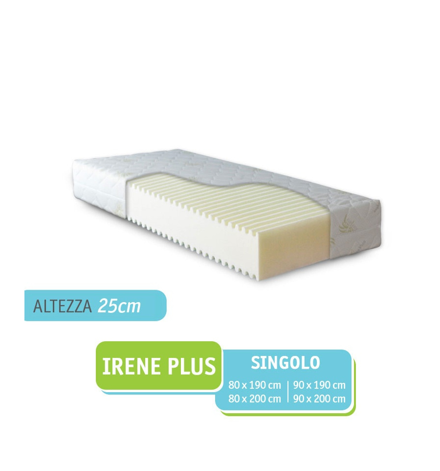 Il materasso singolo Irene Plus è alto 25 cm in tutto ed è formato da una lastra in poliuretano espanso con una superficie modellata secondo nuove tecniche ergonomiche che garantiscono un piacevole effetto auto-massaggiante per la colonna vertebrale.